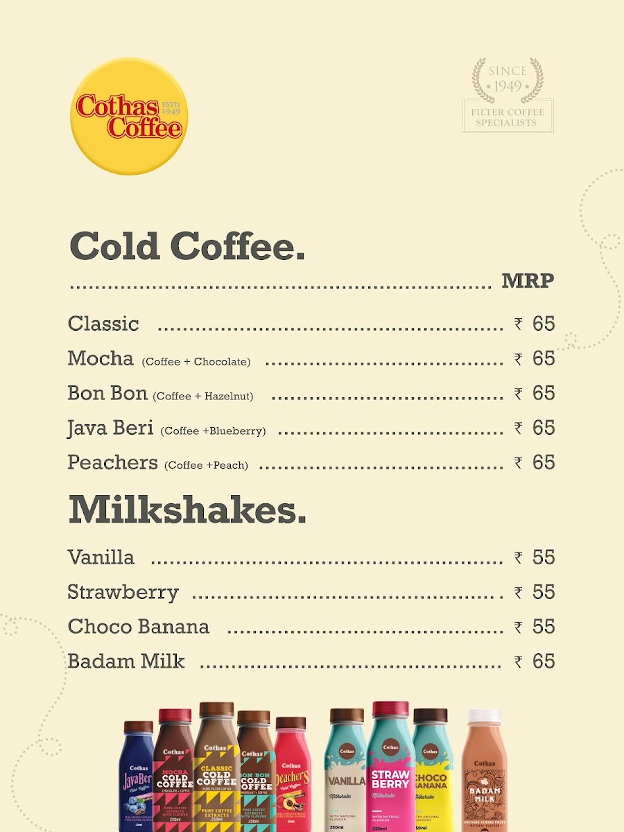 “ Cothas Coffee, Mylapore – A Coffee Lover’s Paradise Nestled in the bustling streets of Mylapore, Cothas Coffee is a haven for true coffee enthusiasts. Though small in size, this cozy and compact coffee joint offers an experience that is rich in flavor and aroma, making it an unmissable spot for those who appreciate a good cup of coffee. From the moment you step in, the inviting aroma of freshly brewed coffee greets you, setting the perfect tone for your visit. The ambiance, though minimalistic, has its own charm. It’s the kind of place where you can enjoy a quiet moment of indulgence amidst the vibrant neighborhood. Cothas Coffee offers a selection of coffees that cater to a variety of palates. The brews are perfectly balanced, showcasing the brand’s expertise in crafting an authentic coffee experience. Pair your coffee with one of the light snacks available, and you’re in for a delightful treat. What truly stands out is the pricing. Despite the high-quality coffee and the brand’s legacy, the prices are incredibly reasonable, making it accessible for everyone. Whether you’re a casual coffee drinker or a connoisseur, you’ll find the offerings here worth every penny. While the space is compact, it adds to the overall charm, creating an intimate setting that feels personal and inviting. It’s perfect for a quick coffee break, a casual catch-up, or simply enjoying some time on your own. Cothas Coffee in Mylapore is a gem for anyone who values authentic coffee experiences. Highly recommended for its quality, affordability, and the sheer joy of sipping a perfectly brewed cup in a quaint setting. Don’t miss it if you’re in the area—you’re sure to leave with a smile and a newfound appreciation for coffee! ”